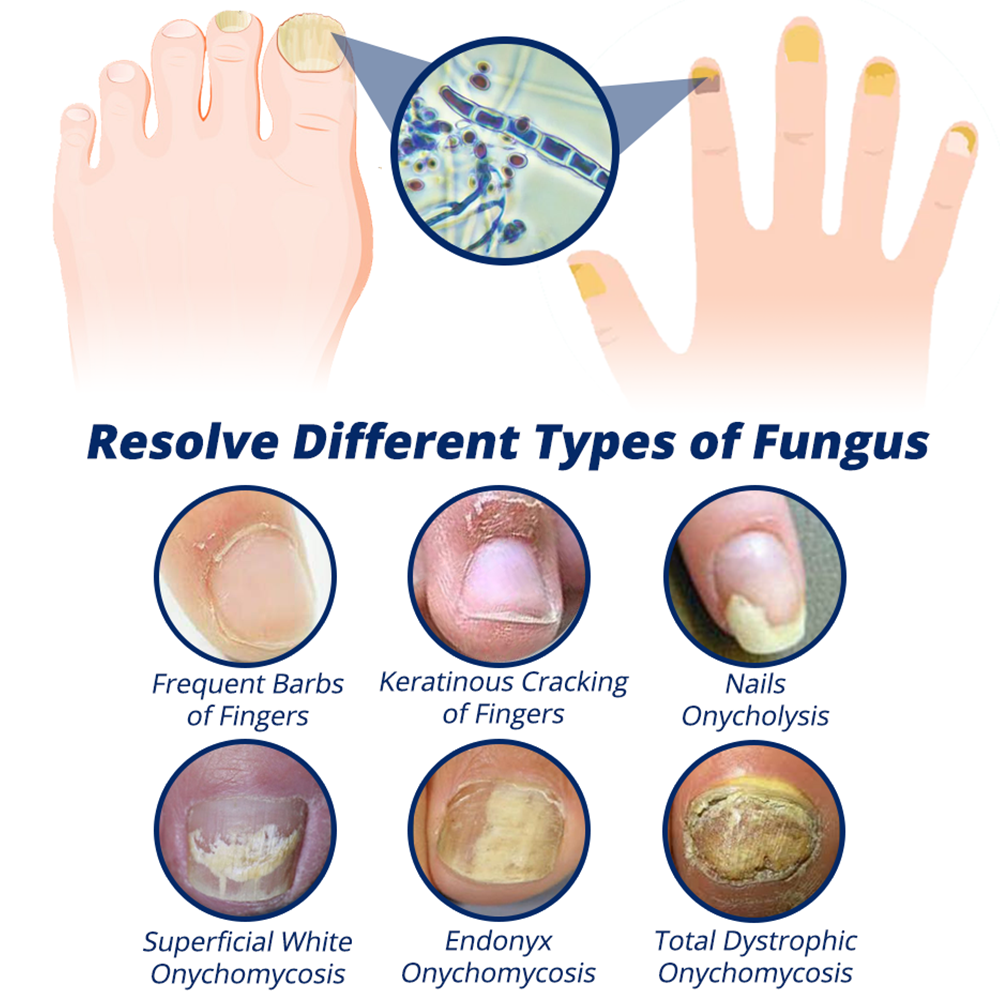 The 7-Day Nail Essence Pen is specifically designed to combat onychomycosis, a common fungal infection of the nails. This advanced formula is packed with potent antifungal ingredients that work synergistically to eliminate the fungus. The serum's powerful action revolves around inhibiting the growth of the fungus by targeting the root cause of onychomycosis and safeguarding against future fungal invasions. By fortifying the nails, the serum promotes a healthier nail environment and ensures long-lasting protection. Our breakthrough formula is designed to tackle various types of fungal infections, including:
