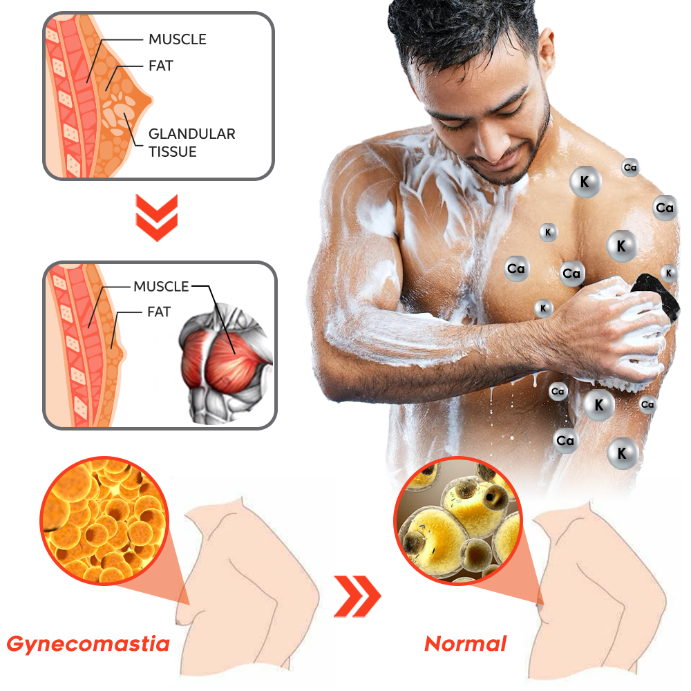Being overweight (obesity) is a common cause of gynecomastia, as overweight can increase levels of estrogen, which can cause breast tissue to grow. In the context of addressing gynecomastia, the release of Potassium and Calcium from Activated Charcoal soap can play a significant role. Potassium and Calcium are an electrolyte that helps maintain fluid balance and supports proper muscle function, and muscle contraction.