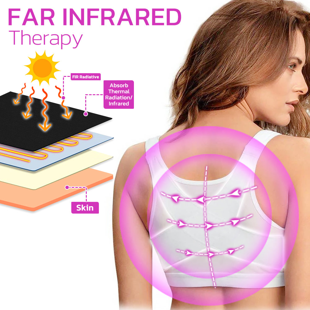 The bra's inner criss-cross bands are infused with Germanite materials, enhancing the effectiveness of the infrared therapy. This innovative feature harnesses the power of far infrared rays to penetrate deeply into the skin and underlying tissues, stimulating the body's natural physiological processes. This results in an effective enhancement and rejuvenation of sagging breasts, leading to improved breast firmness and shape with ease.