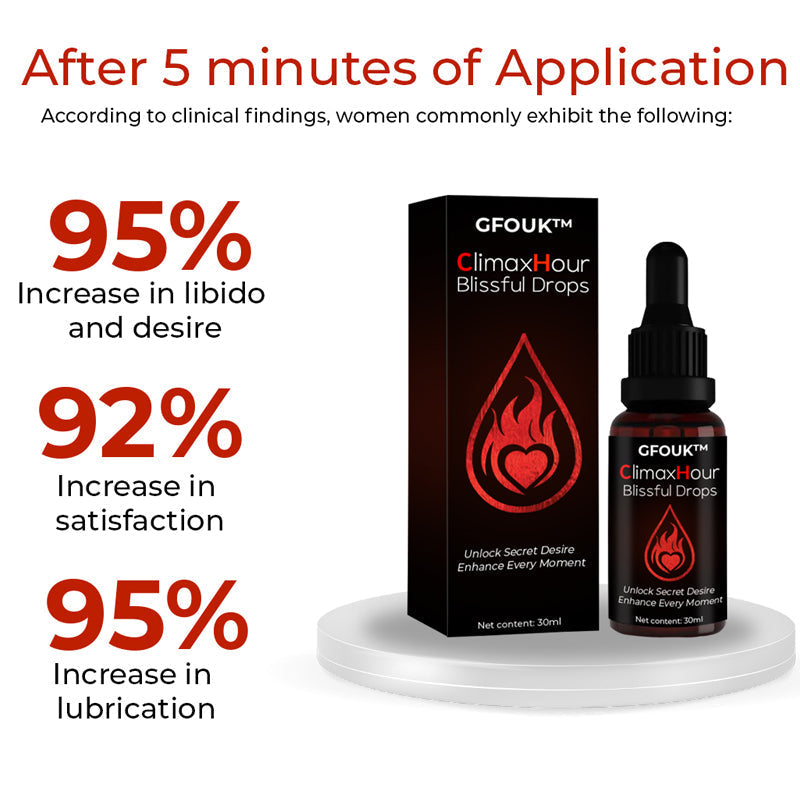 Thankfully, GFOUK™ ClimaxHour Blissful Drops accommodate the desires that reside within the female body and target the distinctive characteristics of female sensuality. See how magically she changes as she ventures into a new world of intense pleasure and deep connection. To show how much you care about her and how much you want to make her happy, you can now surprise her with GFOUK™ ClimaxHour Blissful Drops. These drops are the key to unlocking her inner goddess.