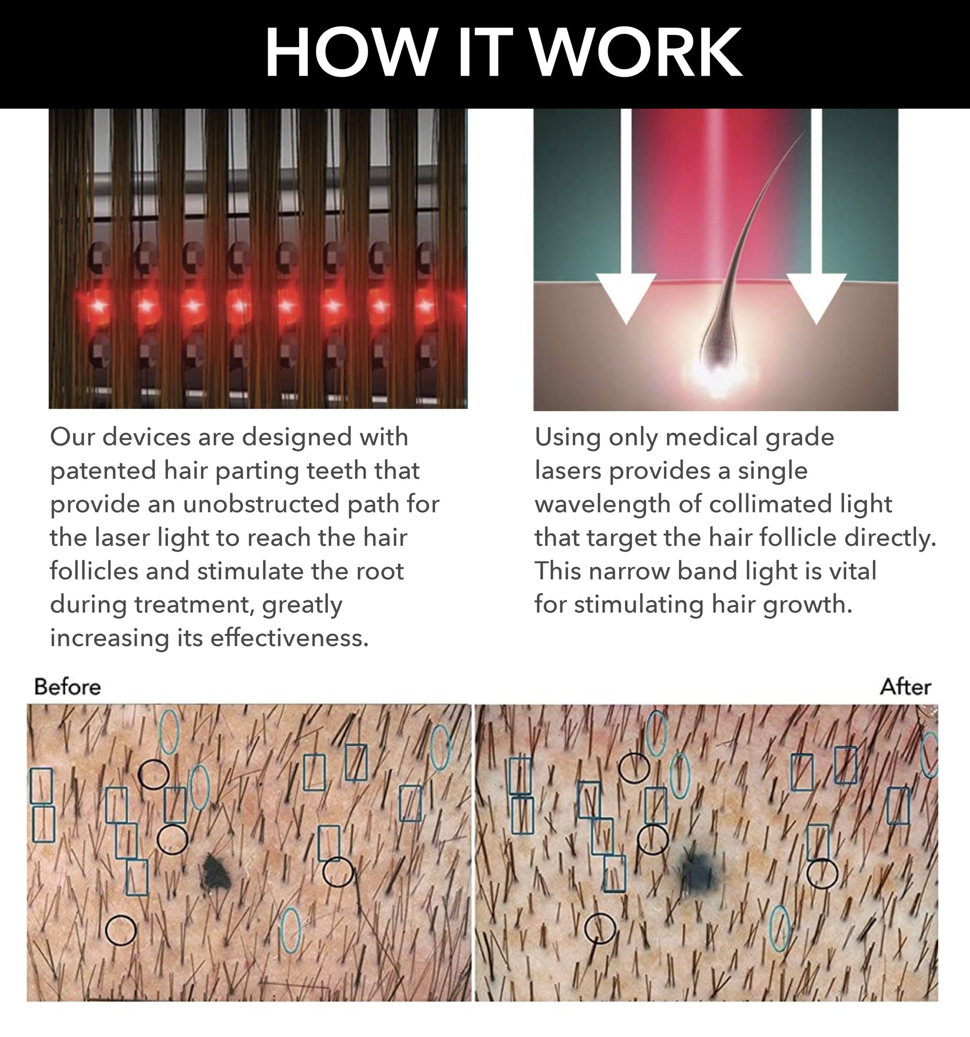 Our lasers provide collimated light, which travels in straight lines. This focused light penetrates the scalp to reach your hair follicles. Increases blood circulation which provides a greater flow of vitamins, nutrients, and oxygen directly to the hair follicle, encouraging growth. It also helps remove waste such as DHT, a main contributor to hair loss.