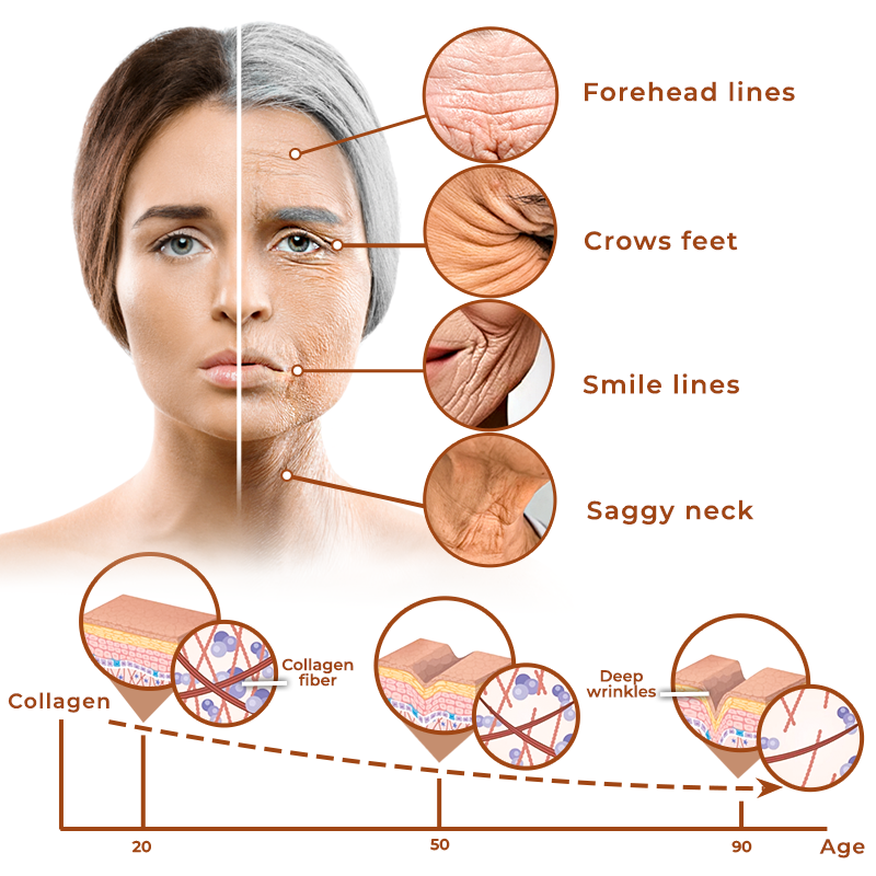 As we age, our skin becomes increasingly vulnerable to the effects of gravity. The consistent pull of gravity results in a downward shift, and the skin naturally thins over time, causing it to lose the vital support of collagen and, in turn, its original elasticity and firmness. This process ultimately leads to sagging, which is especially noticeable in areas where the skin is naturally thinner or lacks sufficient underlying support, such as the forehead lines, crows feet, smile lines, and saggy neck. This collective aging effect becomes evident.