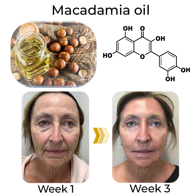 Macadamia oil: Macadamia oil contains tocopherols (vitamin E) including hydration that help stoping premature aging. These antioxidants help to neutralize the damaging effects of oxidative stress, reducing the appearance of fine lines, wrinkles, and age spots and skin aging issue.