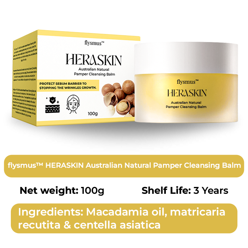 "With its exceptional blend of Matricaria recutita, Centella asiatica, and Macadamia oil, this cleansing balm delivers remarkable results that go beyond your typical makeup remover. The flysmus™ HERASKIN Australian Natural Pamper Cleansing Balm helps to nourishes and hydrates the skin to prematuring aging of the face while maintaining the sebum barrier. It effortlessly tackles acne concerns, minimizing enlarged pores and leaving the skin smoother and clearer. Also, it reduces redness and inflammation while gently enhancing the cleansing efficacy. Combined with these ingredients, his powerful duo works together to effectively remove all traces of makeup within a mere 30 seconds." - Emilia Davidson