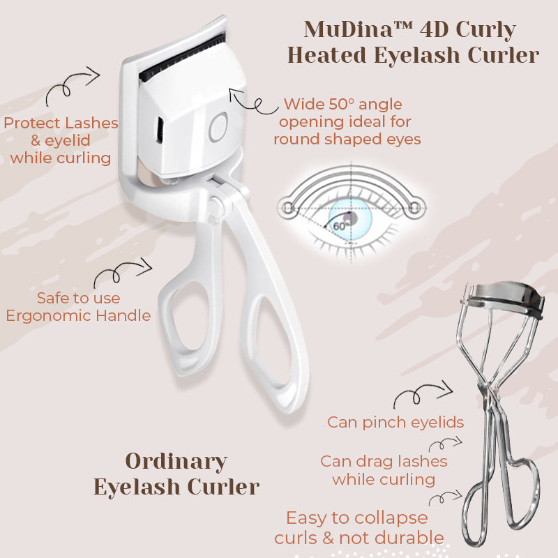 An Essential for Your Beauty Kit! The MuDina™ 4D Curly Heated Eyelash Curler is a convenient and safe solution if you're sick of using ineffective eyelash curlers or heavy mascaras that don't give you the lift you desire. The temperature is designed to be suitable for different types of eyelashes. Low setting (65°C–75°C) is indicated by a green light and is ideal for natural makeup look. A blue light (75°C–85°C) that indicates a high setting is appropriate for heavy full makeup look. Our MuDina™ 4D Curly Heated Eyelash Curler ensures a long-lasting lifting effect and gives your lashes that dramatic look or a naturally thicker appearance that will catch attention owing to its ergonomic design and cutting-edge heating function. In only ten seconds, curl your lashes like a pro. 1. Preheating - Push the switch upward to start process, to get better result please keep enough tome to make it fully warm up for 10 Seconds. 2. Curling - Put the heated curler under your eyelashes, pressing for 3 seconds and from down to up press separately repeat several times. 3. Styling - If needed, appply mascara again to finalize styling,to create fluttering and curling lashes. The curved eyelash head, which properly fits the eyelashes and lasts up to 24 hours longer than conventional eyelashes, instantaneously produces the flawlessly curled eyelashes. may enhance the effects of mascara when used together. Experience an average length and curl growth of up to 100%. The MuDinaTM 4D Curly Heated Eyelash Curler can help you go wherever your mood takes you, whether it's subtle or sassy, defiant or elegant. |