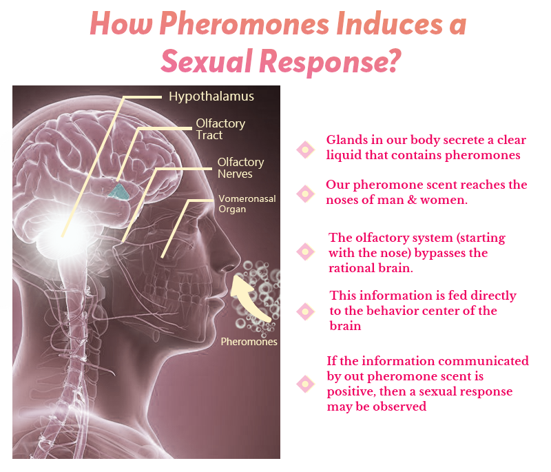When the pheromone-infused aroma arrives at the nostrils, it stimulates the olfactory system, bypassing the rational brain. This sensory information is sent to the behavior center in the brain, where it produces a positive effect on basal behavioral responses.