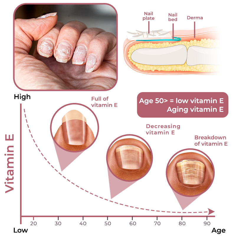 Meet Dr. Doreen Anderson, a seasoned dermatologist with an impressive 23 years of training experience. Dr. Anderson firmly believes that nail health should be treated with the same care as our skin, preventing issues like nail peeling, dryness, and yellowing due to aging or vitamin E deficiency. After extensive research, she discovered that vitamin E supplementation was the most effective solution to combat nail aging and peeling.