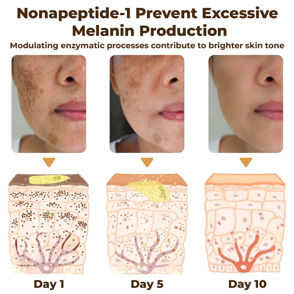 Nonapeptide-1 is able to mimic α-MSH enables it to promote a more balanced distribution of melanin in the skin. It can help prevent excessive melanin production in certain areas, which is a common cause of uneven skin tone and hyperpigmentation. In addition, it can influence the activity of enzymes involved in melanin synthesis, including tyrosinase. By modulating these enzymatic processes, nonapeptide-1 can help regulate the production of melanin and contribute to a brighter and evener skin tone.