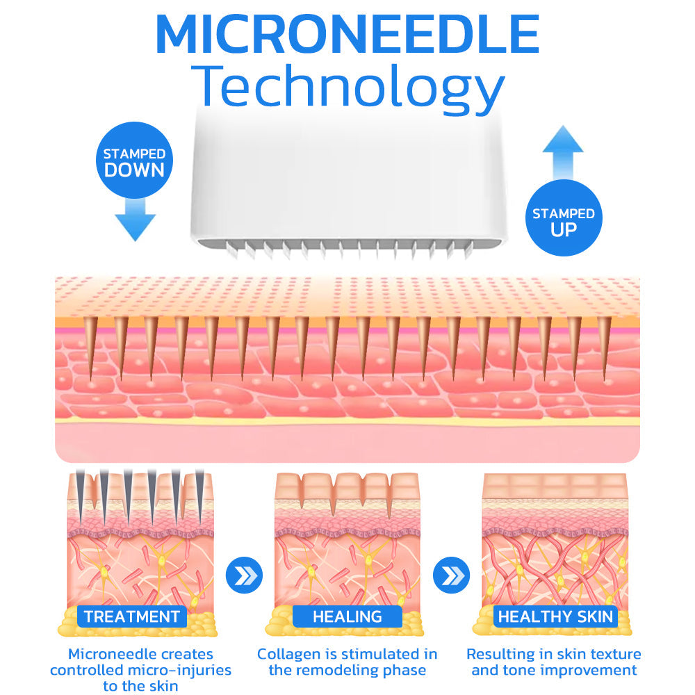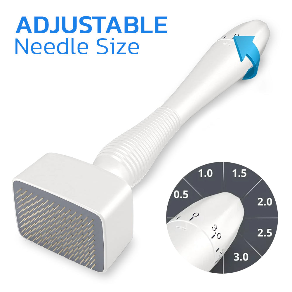 Microneedling entails creating tiny punctures in the skin, stimulating collagen production and resulting in a smoother, firmer, and healthier complexion. Whether you're contending with concerns like rosacea, acne scars, hyperpigmentation, wrinkles, or other persistent skin issues, the adjustable 0-3mm stainless steel needles effectively target specific areas, promoting improved cellular rejuvenation. Additionally, this process enhances product absorption post-microneedling, allowing the skin to absorb up to 80% more applied products.