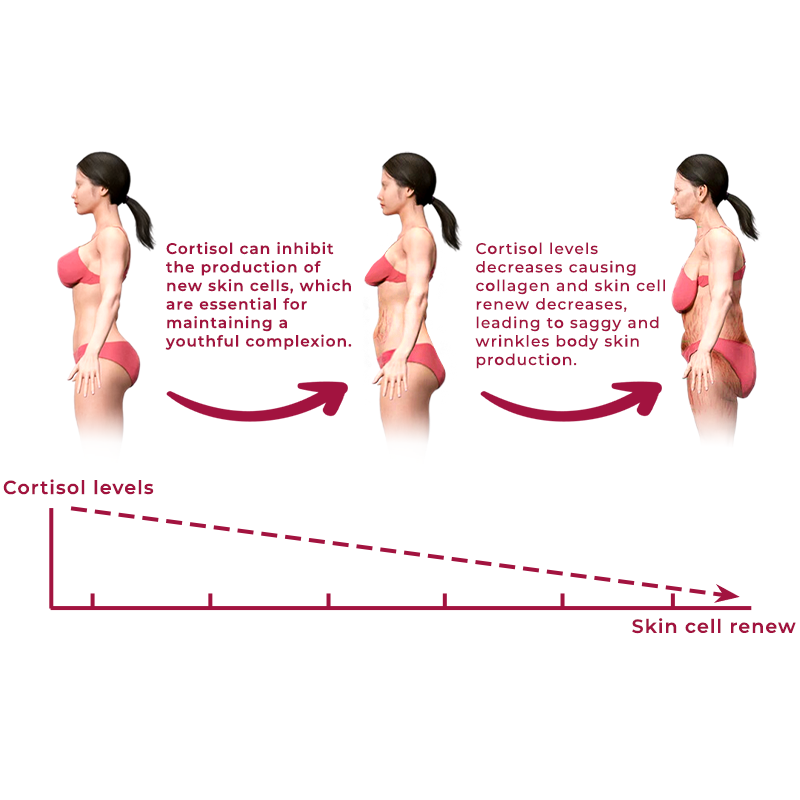 "Lately, I've been collaborating with an anthropology professor to delve into the factors behind collagen depletion. What we've uncovered is that hidden stressors, like the pressures of work and excessive mental strain, can elevate cortisol levels. Cortisol is crucial for maintaining skin health. Elevated cortisol levels can slow down the rate at which cells renew themselves and proper blood circulation, just like the aging process does.This, in turn, results in a gradual loss of skin tightness throughout the body." - Dr Bailey