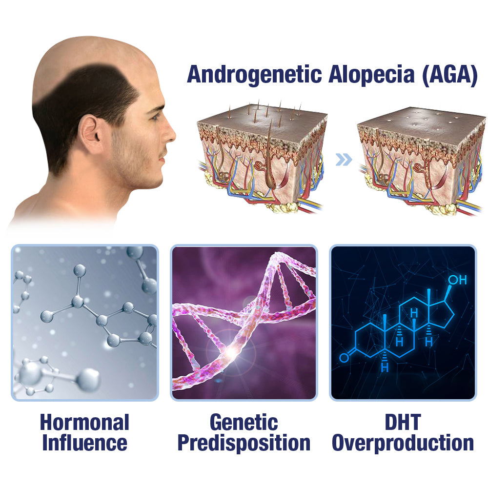 Androgenetic alopecia, commonly known as male-pattern baldness or female-pattern baldness, is the primary cause of hair loss in both men and women. It is characterized by progressive hair thinning and loss. Hereditary factors and hormonal influences are the main reasons behind this condition. The genetic predisposition underlying androgenetic alopecia makes it inherently challenging to cure, as it involves complex interactions between multiple genes and environmental factors, making targeted treatments difficult to develop.