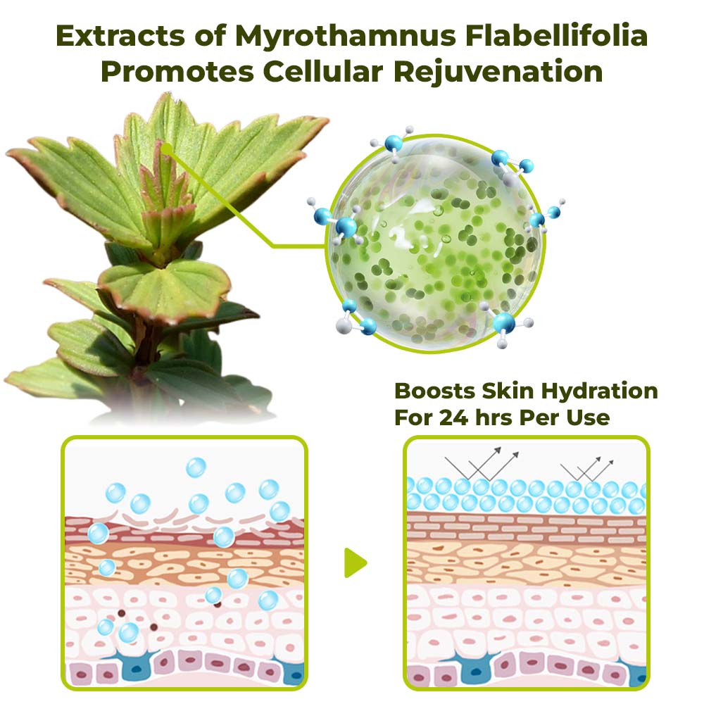 Myrothamnus flabellifolia, commonly known as the "Resurrection Plant", is a plant native to southern Africa. It's known for its ability to survive extreme dehydration and then "resurrect" when exposed to water again. In skincare, extracts from Myrothamnus flabellifolia have been used for their powerful moisture-locking benefits. Thanks to a groundbreaking discovery supported by extensive clinical studies, our lab makes use of the excellent protective, detoxifying, and self-repairing mechanisms of the Myrothamnus flabellifolia plant in the product of the cream, which helps the skin "revive" and stay hydrated for 48 hours.