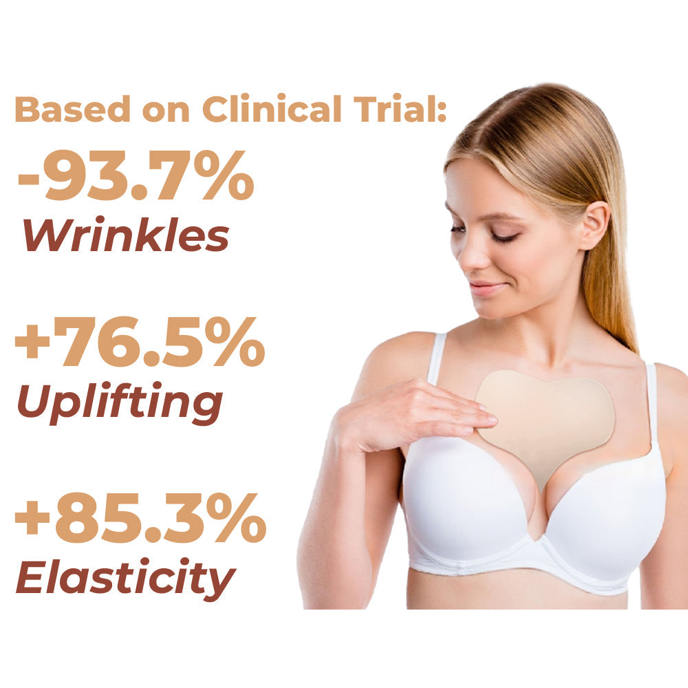 Collagen peptides, also known as hydrolyzed collagen, are collagen proteins that have been broken down into smaller, more easily absorbed fragments. Collagen peptides are believed to promote collagen production in the skin. By incorporating collagen peptides into our treatment patch, it leads to improved skin texture and elasticity in the chest area, resulting in a rejuvenated skin appearance within a span of 3-5 weeks.