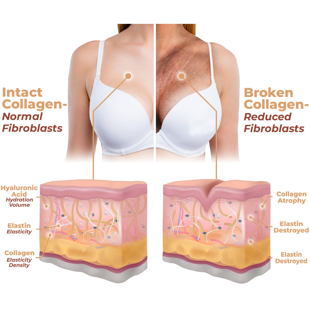 As we age, our body's natural production of collagen and elastin diminishes. These play a crucial role in maintaining the firmness and elasticity of the skin in the chest area. This natural aging process can result in the formation of wrinkles and the sagging of the breast.