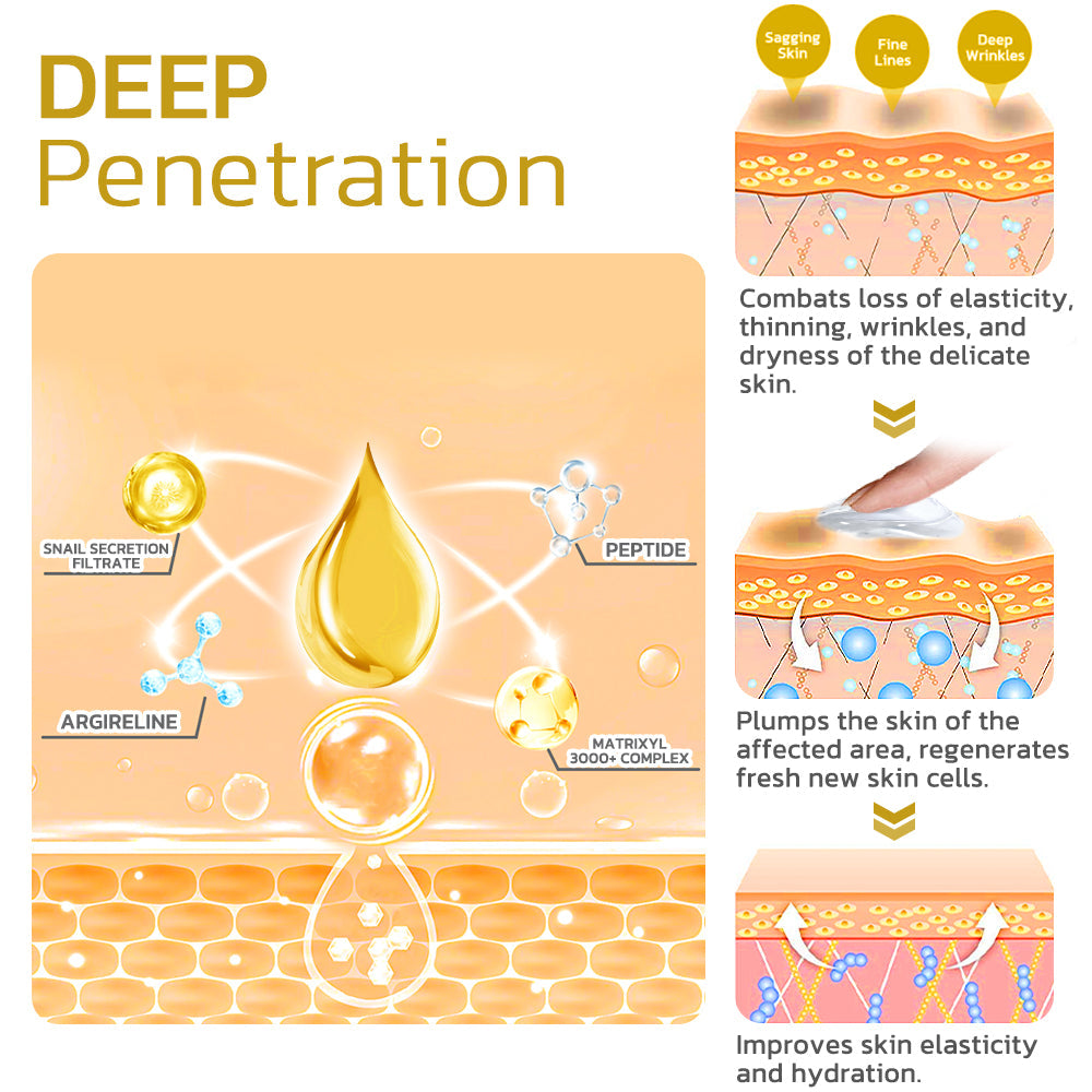 The flysmus™ Snailcollagen Lifting and Firming Cream is formulated to reduce and lift wrinkles on the skin. Its key ingredients, including snail secretion filtrate, Matrixyl 3000+ Complex, Argireline, and peptides, work together to promote collagen production, increase skin thickness, stimulate cell regeneration, and reduce the appearance of wrinkles and fine lines. When applied to the skin, it helps to replenish the skin's collagen levels, which can help to reduce the appearance of fine lines and wrinkles. It also helps to improve skin hydration, making it look more plump and youthful.