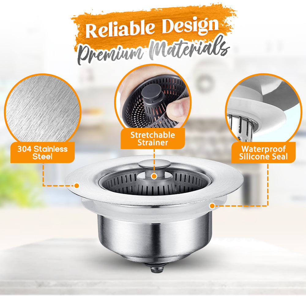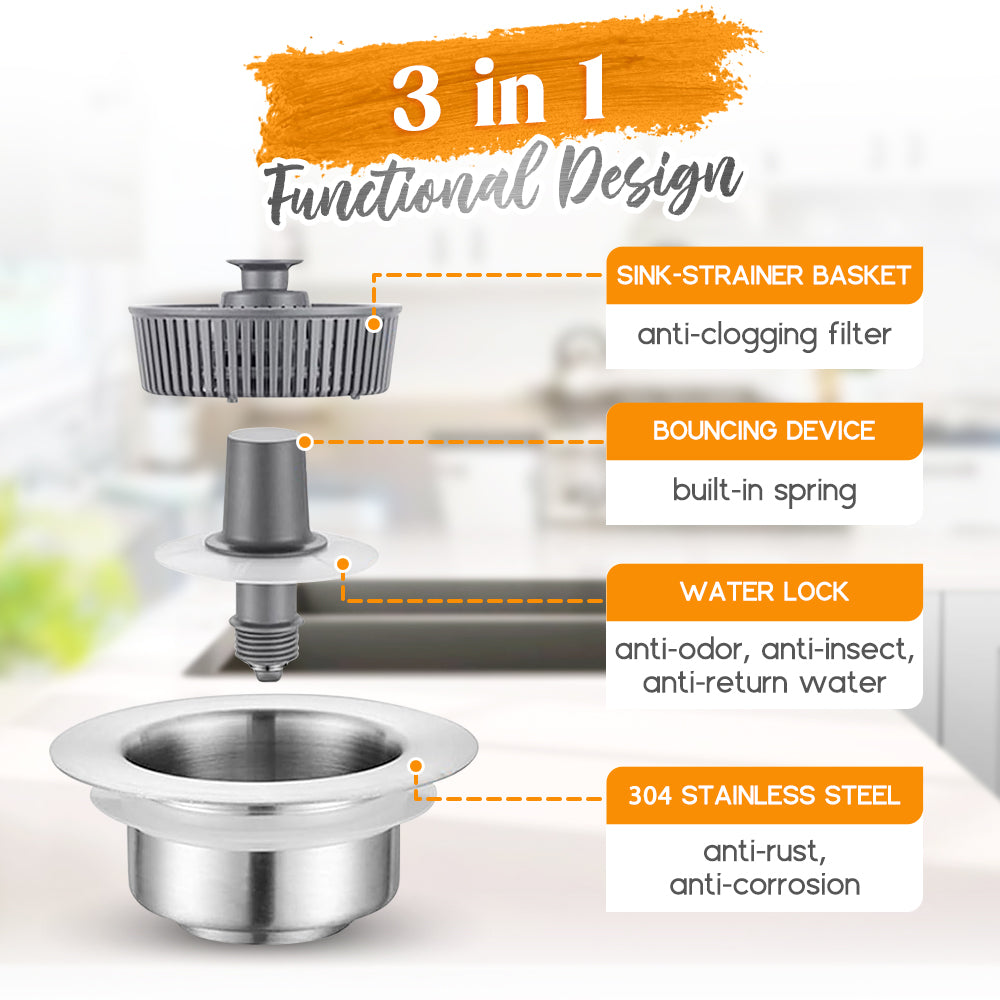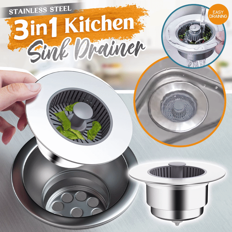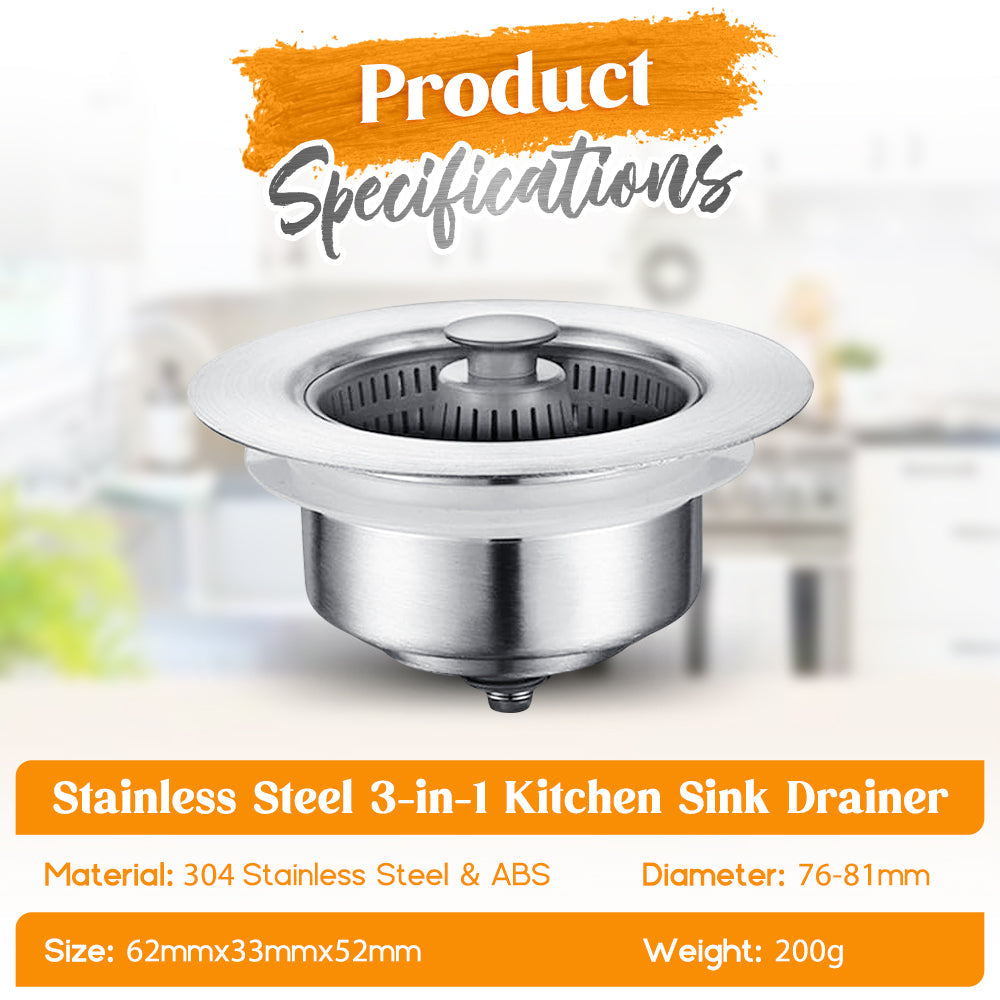 The Stainless Steel 3-in-1 Kitchen Sink Drainer features an enhanced one-piece spring-loaded design and three large drain apertures for swift drainage, averting sluggish draining and blockages. Plus, it facilitates effortless cleanup of food waste, keeping your hands clean.