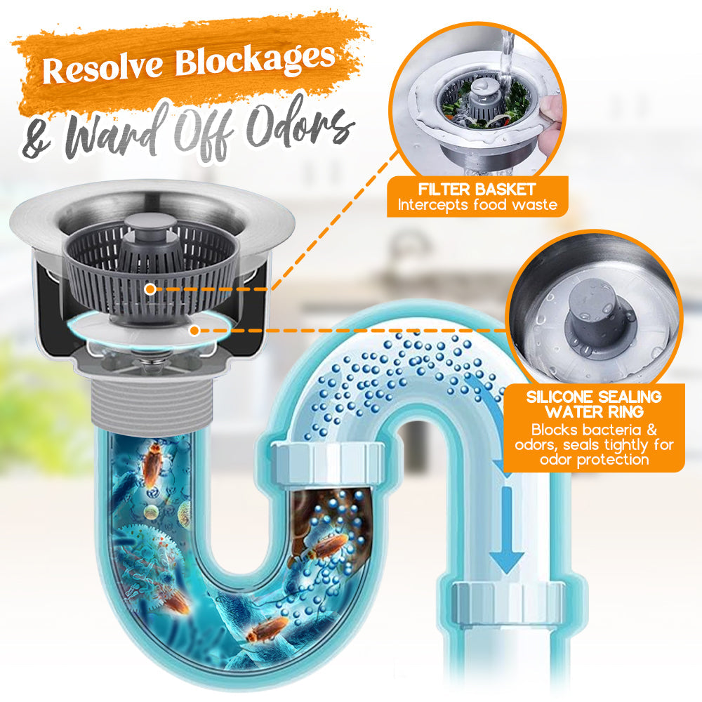 No more clogged sinks! The Stainless Steel 3-in-1 Kitchen Sink Drainer efficiently sifts through food waste impurities, ensuring smooth water flow by blocking large food particles from reaching the sewer. Say goodbye to unpleasant odors and pesky insects.