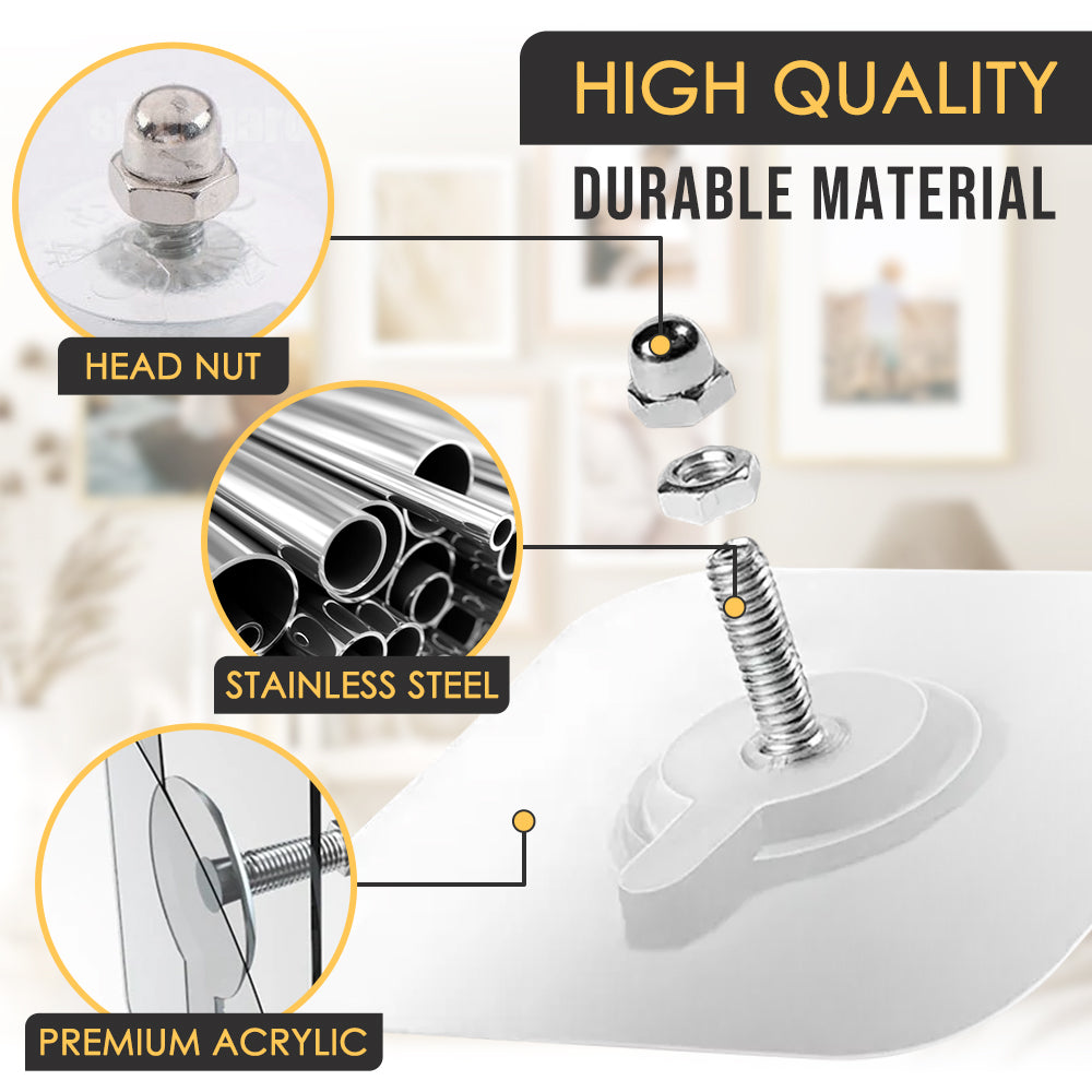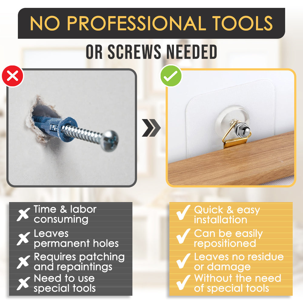 Stick it on smooth surfaces without drilling. Say goodbye to the hassle and mess of drilling holes with Self-adhesive Hanging Screws. No professional tools or screws needed. Keep it easy and quiet.